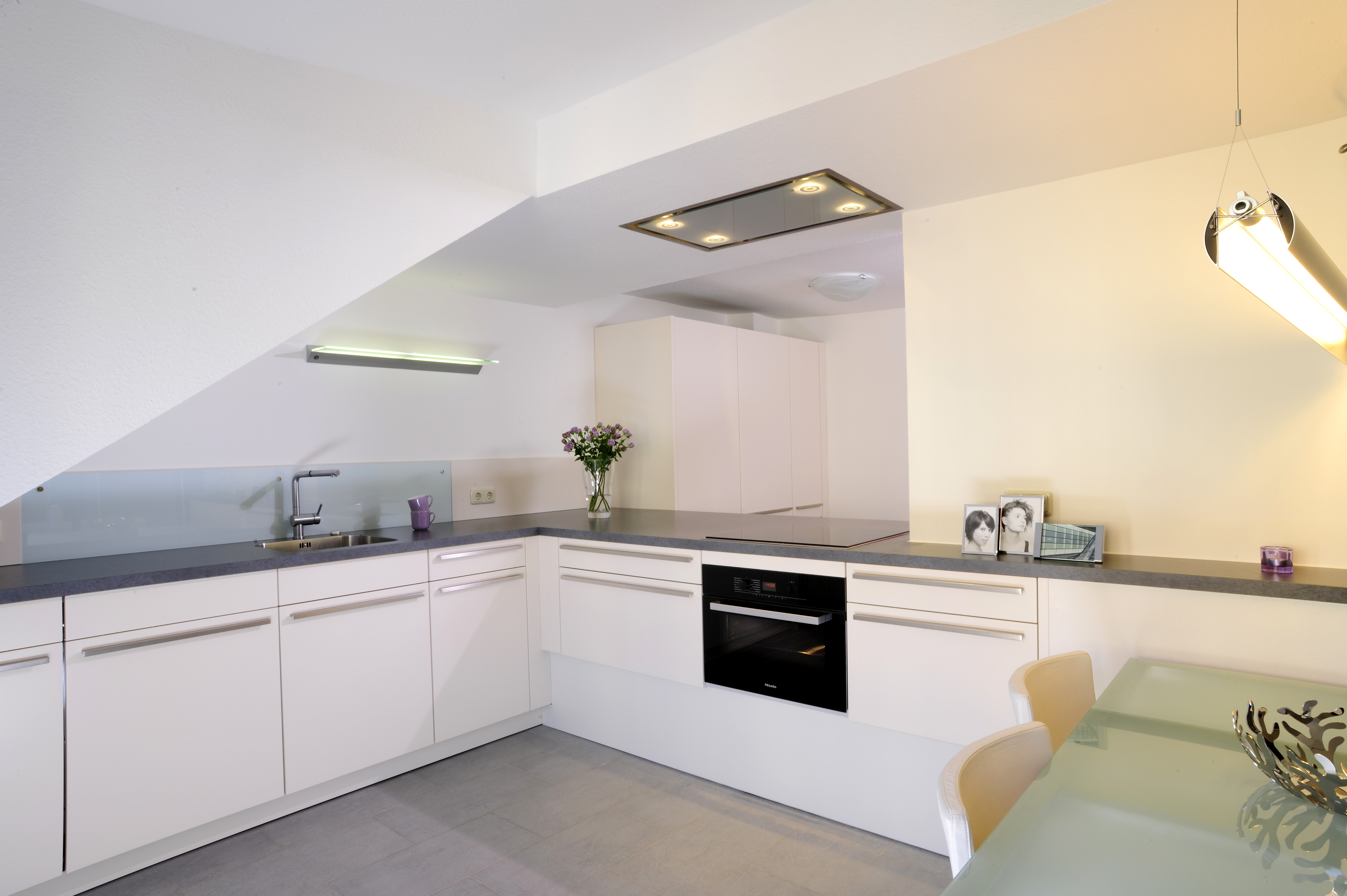 Eine Gastherme, die sich hinter der Hochschrankfront versteckt. Ein abgehängtes Trockenbauelement nimmt den Deckenlüfter auf und bricht gleichzeitig den Winkel zwischen Schräge und Decke. Der Seidenglanz der Möbelfront und das aufgehellte Bodenholz geben dem kleinen Dachraum Größe. Verstärkt wird dieser positive Effekt durch die indirekte Beleuchtung der transparenten Unterschrankfronten.